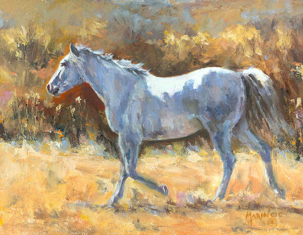 A gray horse strides with quiet strength across the golden brush, embodying the spirit of the West.