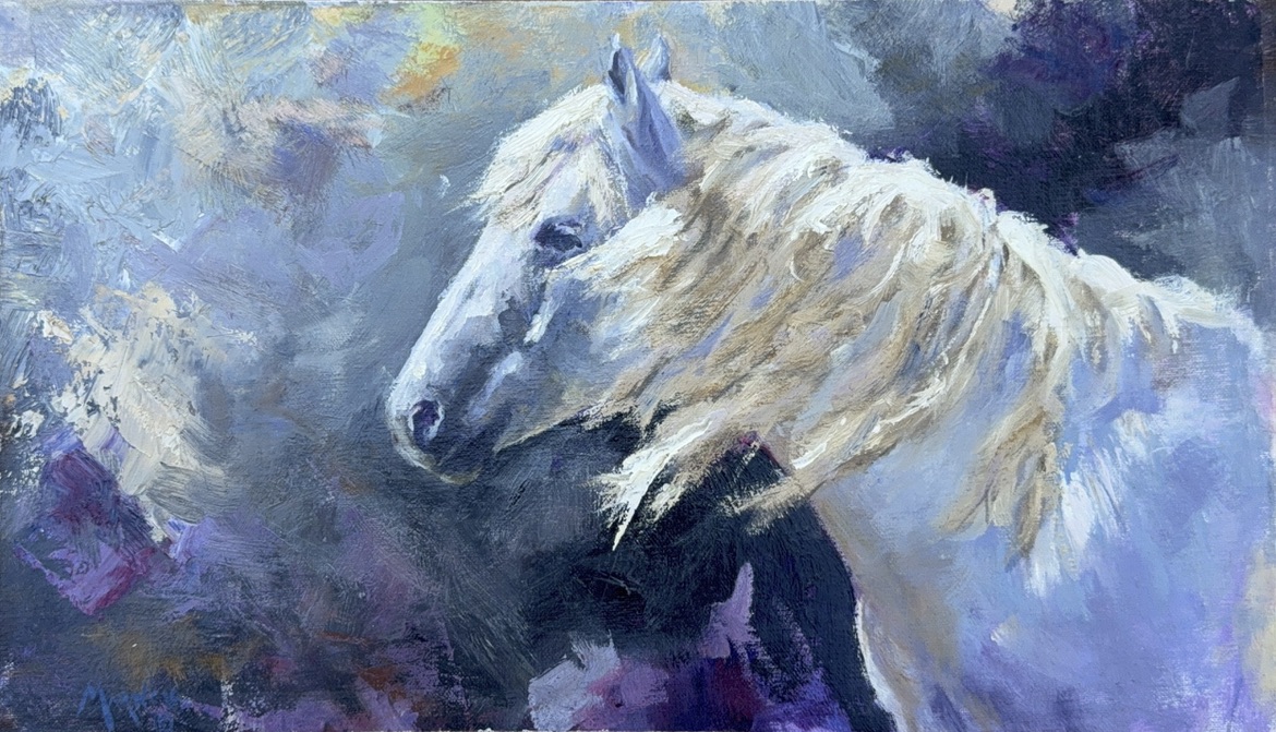 A white horse emerges from cool shadows, its flowing mane illuminated by a soft, ethereal light that cuts through the midnight hues.