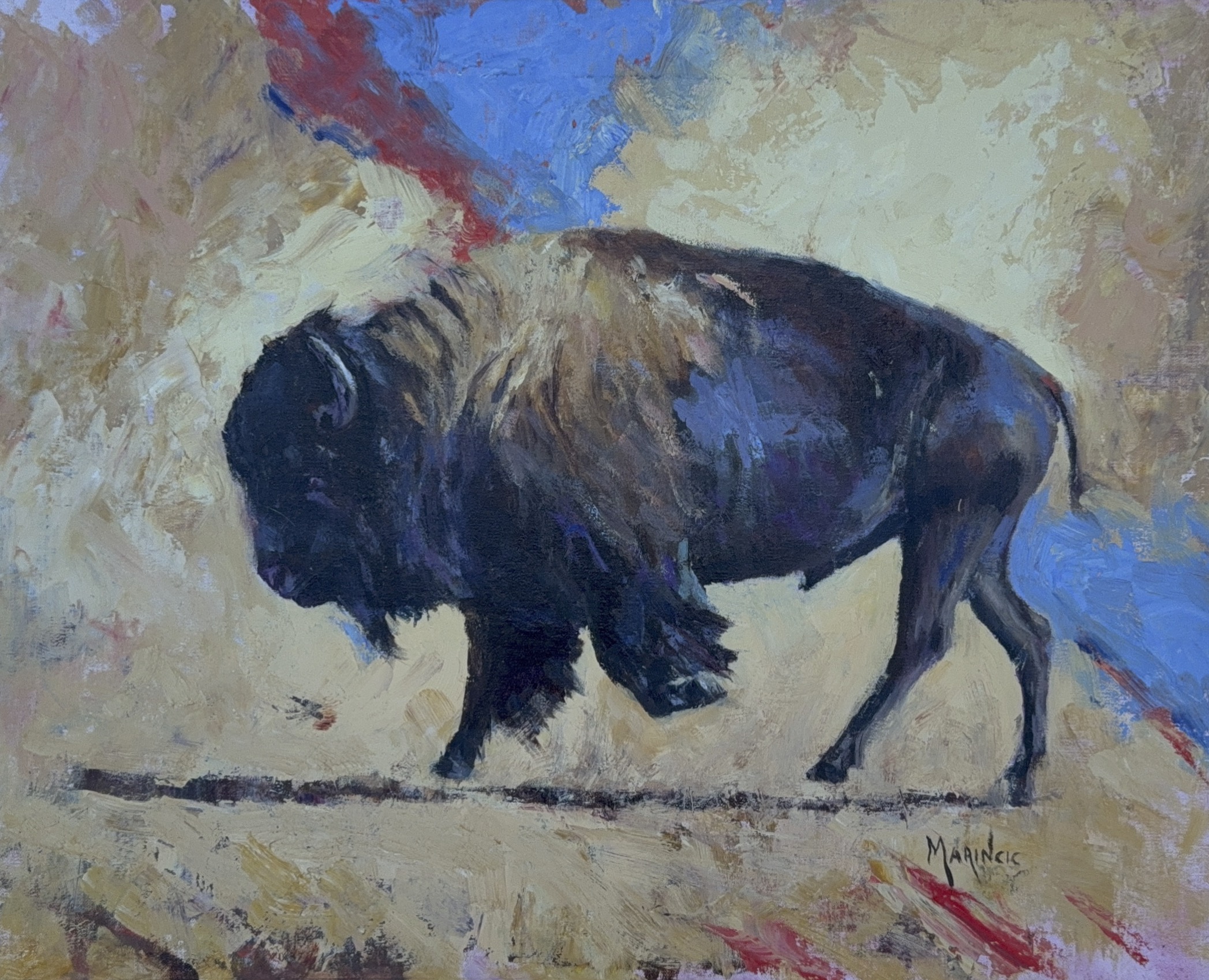 A powerful bison strides forward, its dark form contrasted against bold strokes of red, blue, and gold that echo the wild energy of the plains.