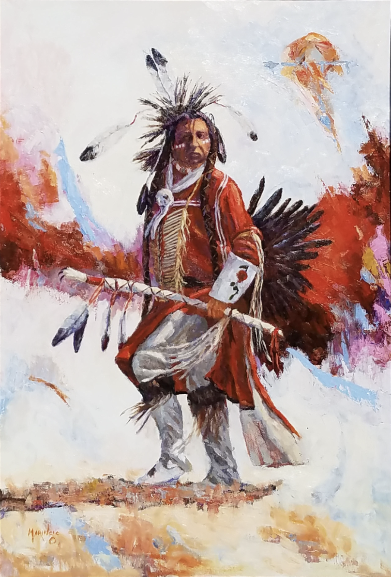 A Shoshone dancer in striking red regalia moves with grace and power, his feathered staff and headdress honoring tradition against a backdrop of vivid color.